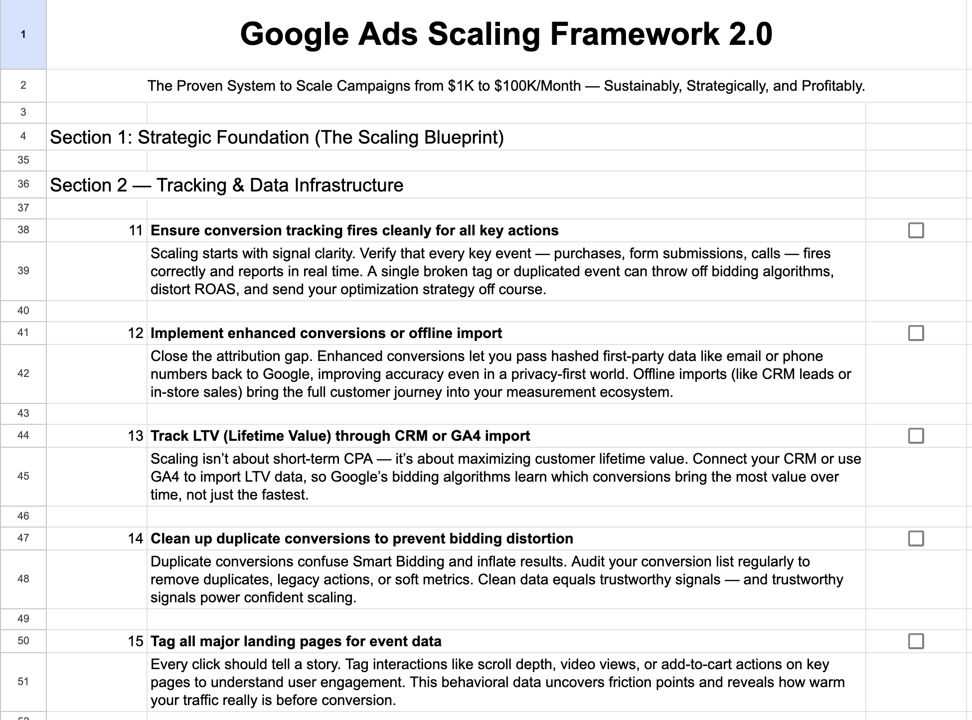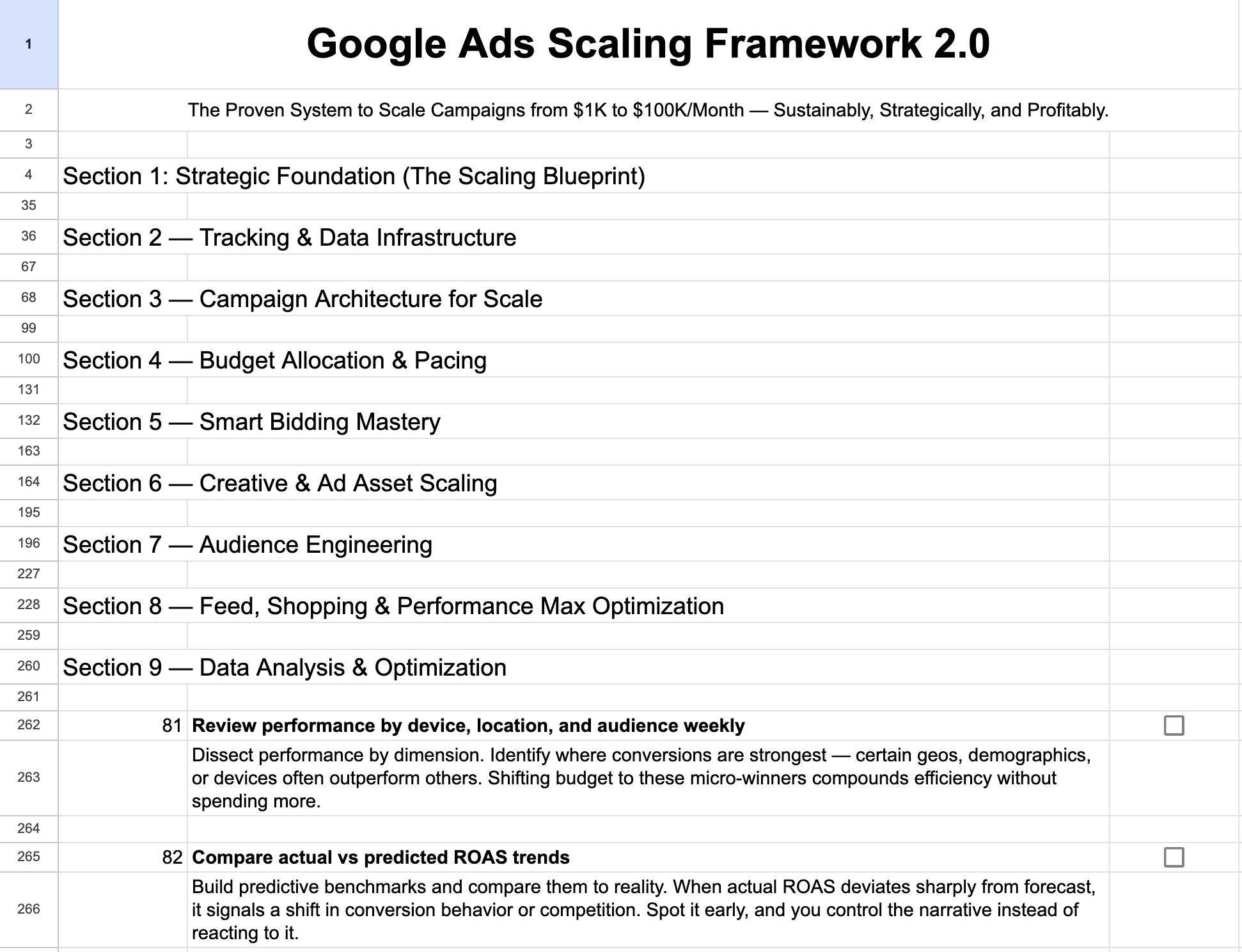 The framework covers everything from defining revenue goals, mapping funnels, and setting CAC and ROAS thresholds, to building high quality tracking systems, campaign architecture, Smart Bidding mastery, audience engineering, creative testing, and scaling automation. This is not theory. Every point shows you what to do, why it matters, and how it impacts long term scaling performance.